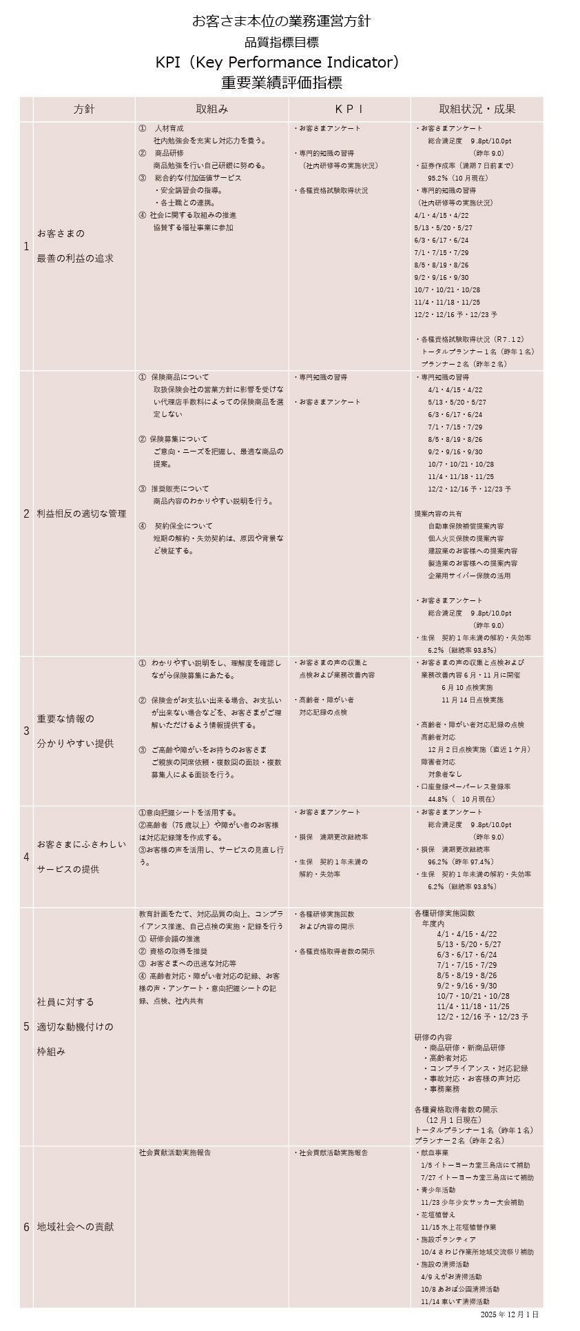 ・保険販売等においては、お客さまを取り巻くリスクの分析やコンサルティング活動等を通じて、お客さまの意向と実情に沿った適切な最大限配慮した商品設計、販売・勧誘活動を行ってまいります。